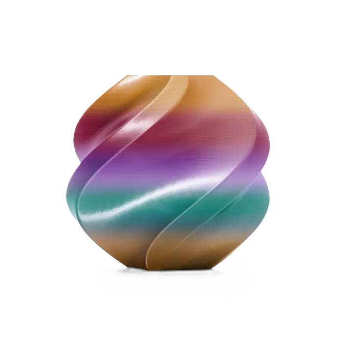 Este filamento pertenece a la línea PLA Silk Gradient, ofreciendo entre 2 y 4 cambios de color por bobina, lo que aporta profundidad y dinamismo a cada pieza. Es ideal para modelos decorativos, figuras, jarrones, esculturas y proyectos donde la estética es clave.